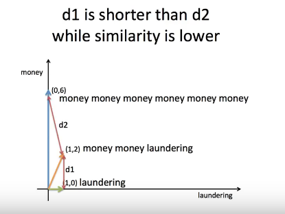 (1, 2)과 (0, 6)의 유사도가 더 높음에도 불구하고, 유클리디언에서는 (1, 2)과 (1, 0)의 유사도가 더 높다는 결과가 나오게 된다. 그래서 벡터의 크기가 커지게 되면 거리가 점점 더 늘어나기 때문에 크기를 무시하고, 벡터의 방향만 측정하는 방법인 코사인 유사도을 사용하게 된다.