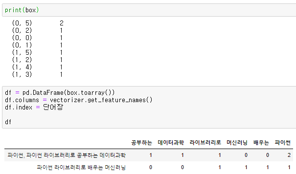 1. 카운트 벡터 생성하기( 벡터화: 단어를 숫자로 바꿔주는 과정 )