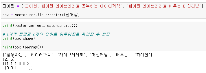 문서를 token count matrix로 변환해주는 vectorizer.fit_transform(list of str ) 기능을 잠깐 알아본다.