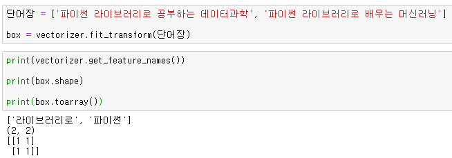 함수의 매개변수 min_df 값은 해당 값보다 낮은 빈도수의 단어는 모두 무시한다는 뜻이다.