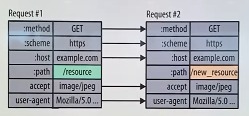- HTTP/1.1의 헤더에는 많은 정보들이 저장되어 있는데, 매 요청시마다 중복된 Header값을 전송하게 되어 불필요하게 Header값이 커지게 된다.