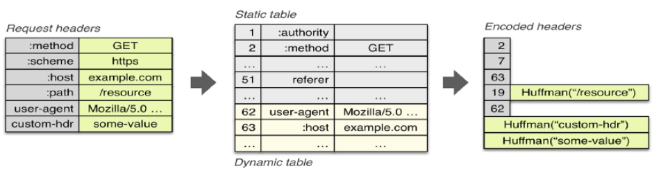 Header 정보를 압축하기 위해 Static/Dynamic Header Table과 Huffman Encoding의 두 가지 기술을 사용한다.
