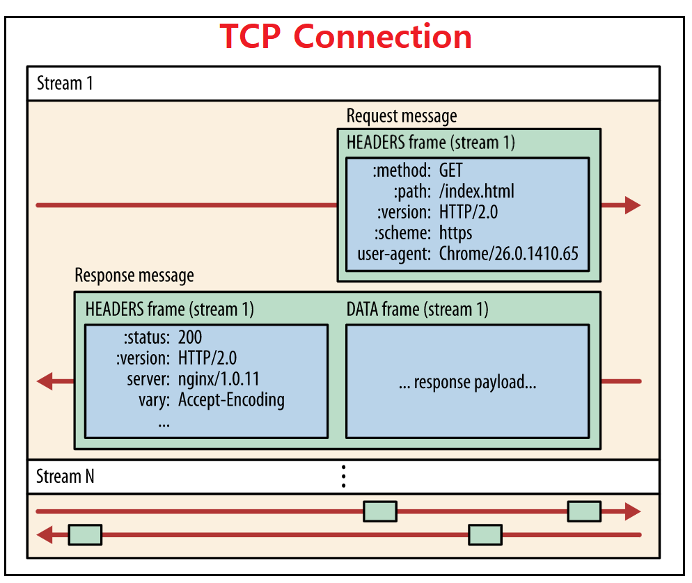 Stream 1은 [요청 메시지 하나/응답 메시지 하나]가 있고, 요청 메시지는 하나의 Header 프레임(GET 요청으로 Data 부분이 존재 하지 않음)으로 구성되어 있고, 응답 메시지는 각각 하나의 헤더 프레임, 데이터 프레임으로 구성되어 있다. Stream N의 그림을 보면, 복수개의 요청, 복수개의 응답 프레임이 하나의 스트림 안에 존재한다. (다중 요청/응답 가능)
