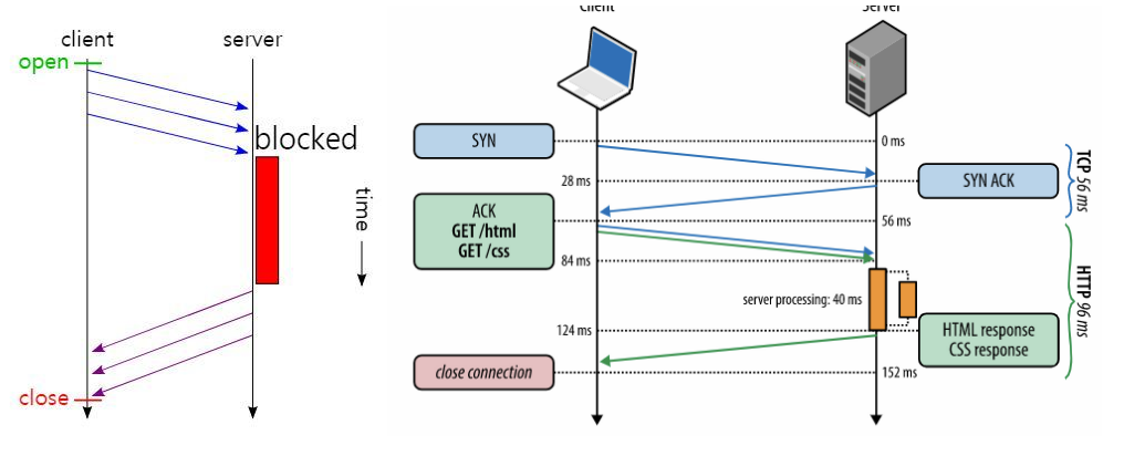 - 첫번째 요청에 대한 응답을 기다리지 않고 두번째, 세번째 요청을 연속적으로 보내 그 순서에 맞춰 응답을 받는 방식으로 지연 시간을 줄이는 방법을 도입하였다.