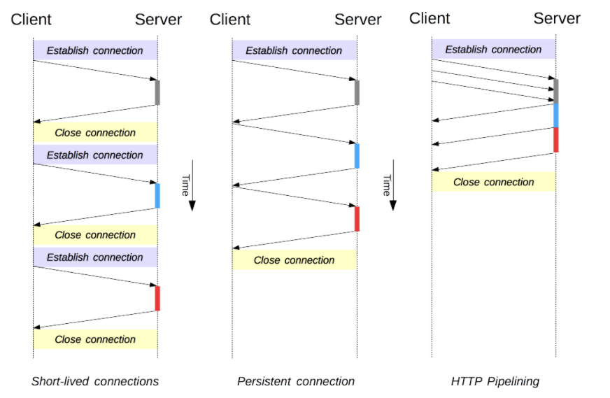 - HTTP/1.0에서는 요청이 1개 보내질 때마다 커넥션이 1개 매번 새롭게 생성(Short-lived connections)되었고 응답이 도착한 이후에 연결을 닫는 형태로 유지되었다. HTTP/1.1에서는 Persistent Connection을 통해 지정한 timeout동안 [요청과 응답] 여러 개를 받을 수 있도록 커넥션을 닫지 않고 재사용을 할 수 있게 하였다.