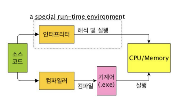 - 컴파일러와 다른 점은 전체 소스 코드를 한 번에 기계어로 변환하는 것이 아니라, 코드를 한 줄씩 읽어들여 다른 중간 코드나 기계어로 변환해서 임시 파일(*.pyc)에 저장하고, 변환한 것을 바로 실행하는 프로그램이다.