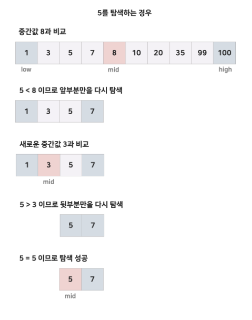 오름차순으로 정렬된 리스트에서 특정한 값의 위치를 찾는 알고리즘이다. 배열중간의 인덱스 값부터 시작하여, 찾고자 하는 값의 대소를 비교하여 탐색의 범위를 반으로 줄여나가는 방식이다.