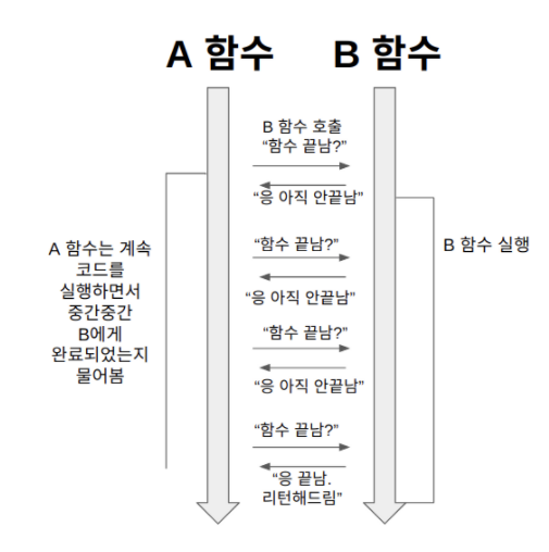 그런데 A 함수는 B 함수의 리턴값이 필요하기 때문에, 중간 중간 B 함수에게 요청을 완료했는지 물어본다. (동기)