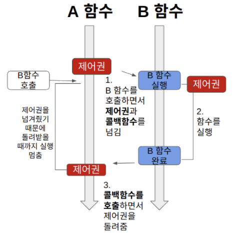 B 함수는 자신의 작업이 끝나면 A 함수가 준 콜백 함수를 실행해 응답한다.