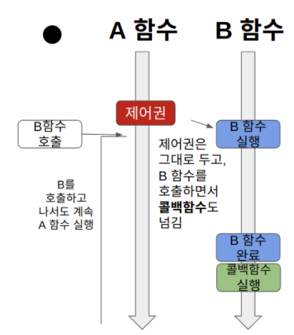 A 함수는 B 함수의 리턴값에 신경 쓰지 않고, 콜백 함수를 보낸다. (비동기)
