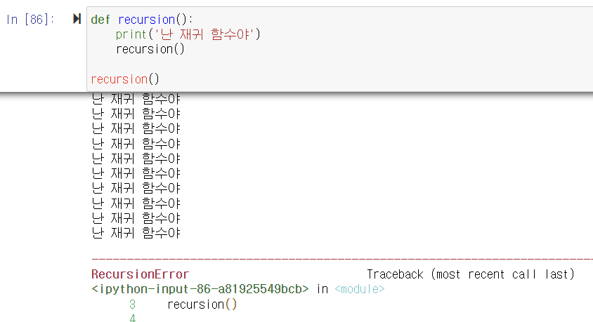 recursion 함수 안에서 자기 자신인 recursion 함수를 호출하고 있는데, 이것이 재귀 함수이다. recursion 함수가 자기 자신을 계속 호출하다가 파이썬이 정한 최대 재귀 깊이를 초과하여 RecursionError가 발생했다.
