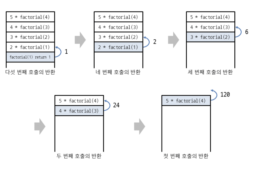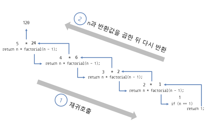 계산 결과가 즉시 구해지는 것이 아니라 재귀호출로 (n - 1)을 계속 전달하다가 종료 조건인 n이 1일 때의 값 1을 반환하면서 n과 곱하고 다시 결괏값을 반환하는 과정을 반복한다.