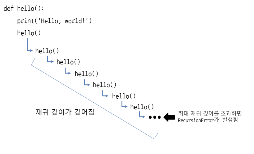 즉, 재귀 함수는 종료 조건을 설정하지 않으면 무한하게 자기 자신을 호출하게 된다.