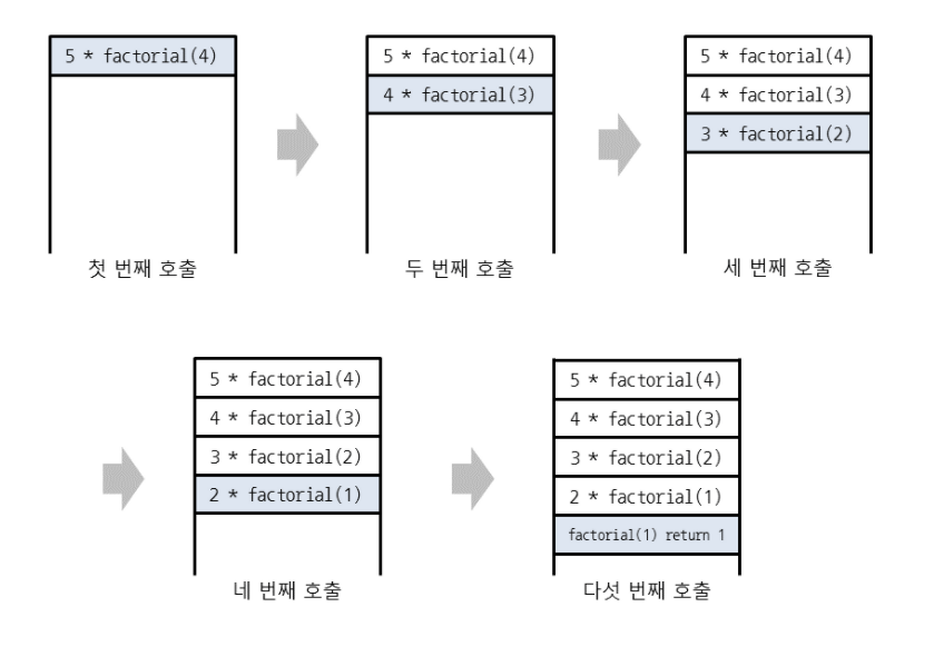 재귀 함수에서는 동일한 함수를 계속해서 호출될 때마다 함수를 위한 메모리가 계속해서 할당된다. 함수가 호출될 때마다 사용되는 임시 저장 메모리를 스택이라고 부른다.