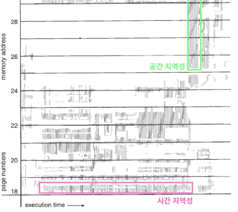 - 시간적 지역성: 최근에 접근된 데이터가 가까운 미래에 또 한번 사용될 가능성이 높다.