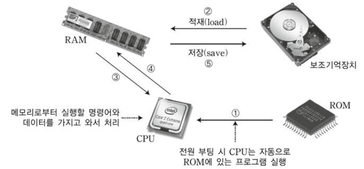 바로 운영체제의 커널이 그 역할을 해준다. 커널은 💡전원이 켜져 있는 동안에는 메인 메모리에 계속 상주하면서 시스템 자원을 관리한다. 커널이 응용 프로그램이나 데이터를 메인 메모리에 적재하는 것을 로드(Load)라고 하며 그 과정을 로딩이라고 한다. 프로그램이 메모리에 적재되면 비로소 CPU는 메모리에 있는 프로그램 명령어들을 읽어와 실행을 한다.