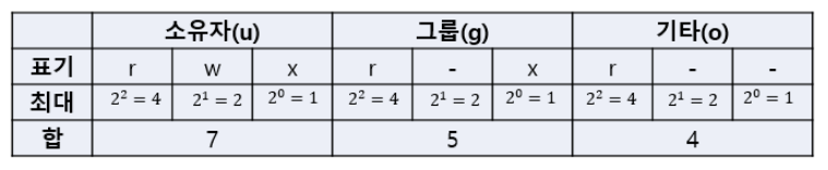 각 자리 수마다 읽기는 4, 쓰기는 2, 실행은 1로 나타내며 필요한 권한을 다 더해서 사용하게 된다.