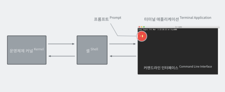 기본적으로 리눅스 커널이 제공하는 기능 위에서 동작한다. 커널은 시스템 자원들을 관리하는 운영체제의 핵심이라고 했다. 쉘이라는 인터페이스를 통해 사용자의 명령어를 커널에 전달하여 시스템 자원들을 관리할 수 있다.