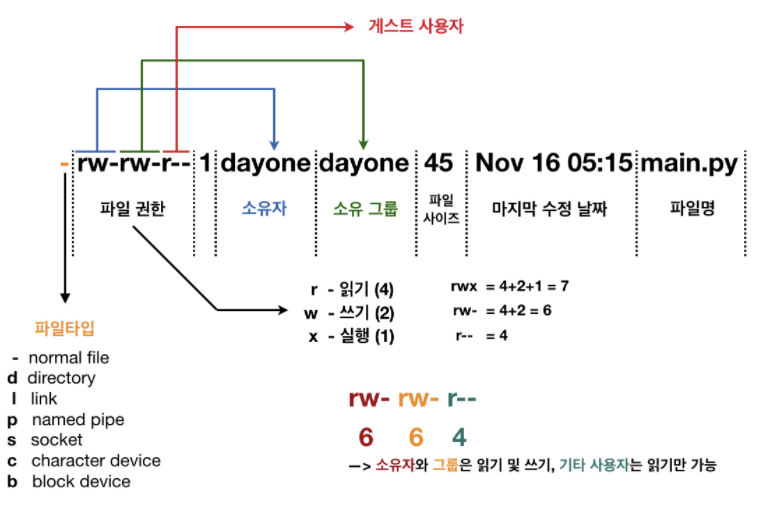 - 파일마다 소유자, 소유자 그룹, 기타 사용자에 대해 각각 읽고(r), 쓰고(w), 실행(x)하는 권한을 관리