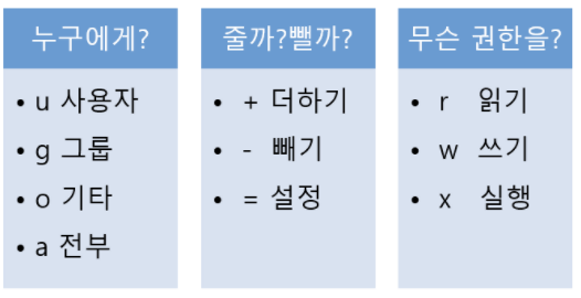 chmod 명령어를 통해서 어떤 사용자에게 어떤 파일 권한을 줄 것인지 문자와 기호로 설정한다.