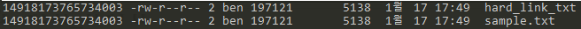 하드링크는 소프트링크와 달리 원본을 가리키는 화살표도 없고, 원본 파일명과 이름만 다를 뿐 원본 파일의 inode번호와 파일 크기 등 모든 것이 똑같다.