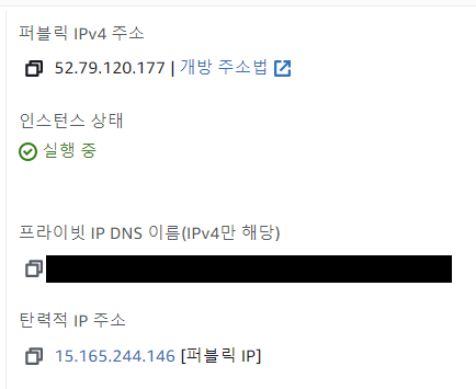 인스턴스가 처음 생성되거나, 중지 후 다시 시작할때마다 퍼블릭 IP를 재할당한다. IPv4 주소체계에서 IP가 워낙 부족한 상황이라, 새로운 EC2 인스턴스가 생성될 때마다 IP주소를 부여하기 어렵기 때문에 EC2 인스턴스가 동작하는 동안에만 IP를 부여하고 멈추면 IP를 반납시키는 형태의 유동적인 퍼블릭 IP를 사용하고 있다.