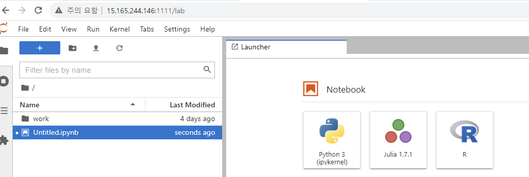3) EC2 서버 IP:1111로 접속해보면 주피터 노트북이 잘 작동되고 있음을 확인할 수 있다.