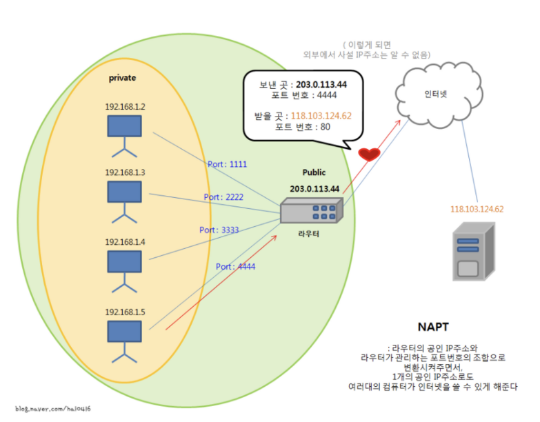 그림처럼 호스트 IP의 각 포트에 서로 다른 컨테이너의 Private IP의 포트를 매핑시켜주는 것이 NAPT의 역할이라고 할 수 있다. 도커에서는 -p 옵션으로 호스트 PC에 8080 포트로 접속하면, 자동으로 해당 컨테이너의 80 포트로 연결한다. 당연히 호스트 PC IP의 8080 포트는 먼저 개방해놔야 하며, 아파치 웹 서버는 기본적으로 80번 포트를 디폴트로 사용하고 있다.