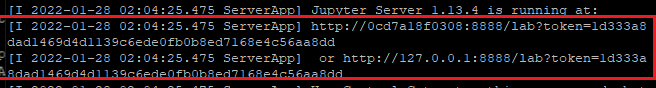 우리가 도커가 아닌 윈도우에서 주피터 노트북을 설치하고 실행하면, 터미널이 자동으로 열리면서 다양한 명령문이 출력되는 표준 출력과 함께 주피터 노트북이 실행되었다. 이 터미널을 확인해보면 주피터 노트북에 접속에 필요한 token이 나오면서 자동 실행되는 것을 볼 수 있다.