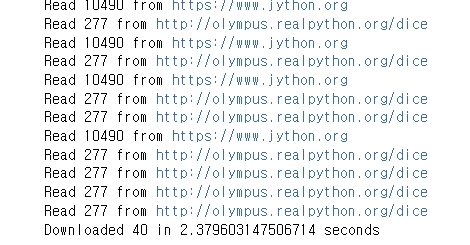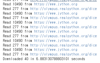 굉장히 간단한 프로그램이다. download_site 함수가 그냥 주어진 URL로부터 내용을 다운받아와서 그 크기를 출력한다. 네트워크 통신을 위해서 requests 모듈의 Session 객체를 사용하였다. 그냥 바로 get() 메서드를 사용할 수도 있지만, Session 객체를 만들어서 사용하면 몇 가지 네트워킹 트릭들을 내부적으로 수행해주기도 하고, 속도를 높이는데도 유용하다. download_all_sites 함수는 사이트 URL 목록을 받고, Session 객체를 생성하여 download_site 함수에 넘겨주어 목록을 하나씩 돌면서 순차적으로 데이터를 다운받게 한다. 비교를 위해 작업이 모두 끝나면 시간이 얼마나 걸렸는지 출력하도록 하였다.
