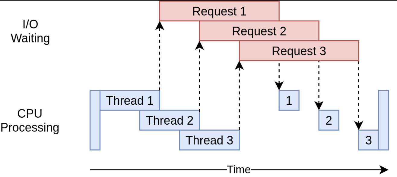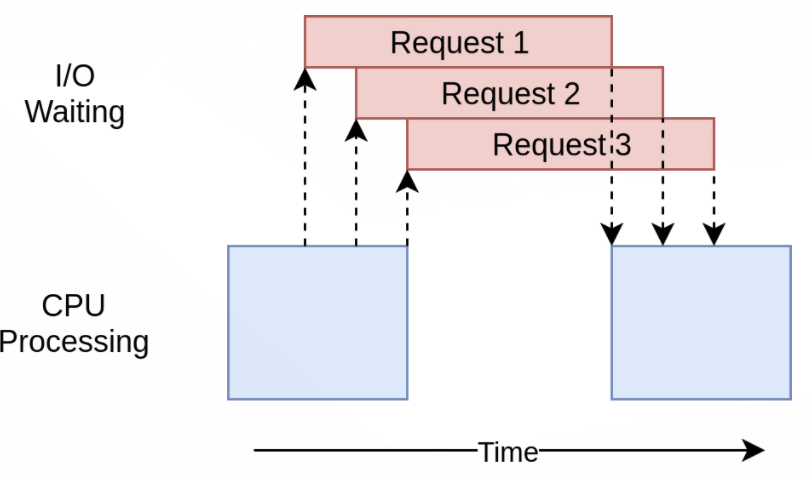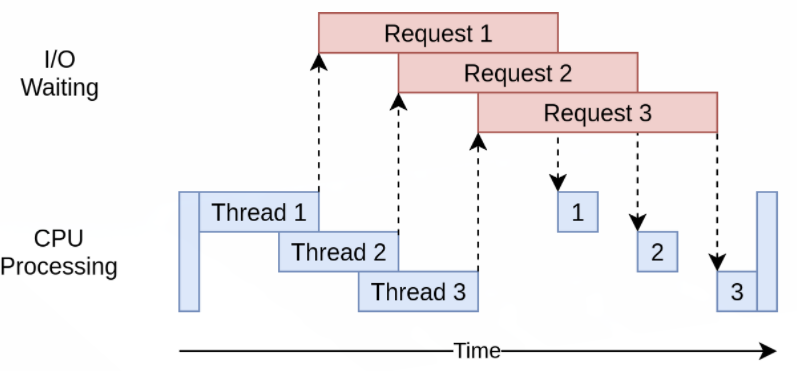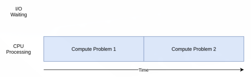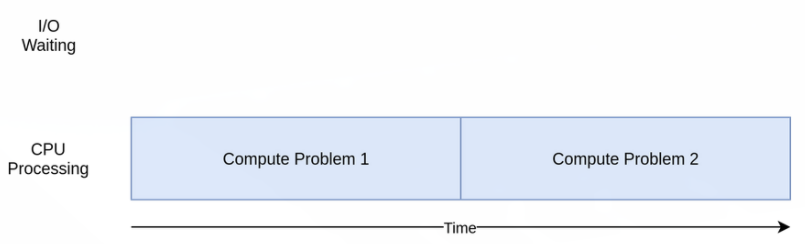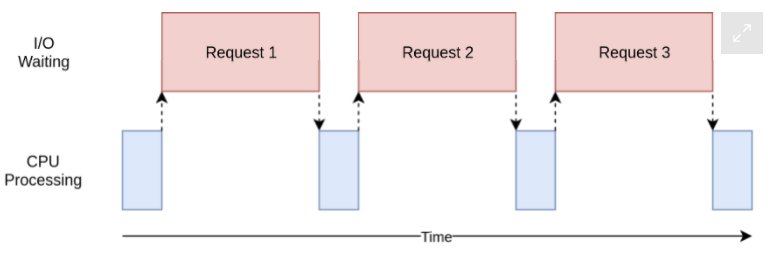 위 그림에서 파란색 박스는 프로그램이 진행 중인 시간을 나타내고, 빨간색 박스는 I/O 바운드 작업이 끝날 때까지 대기하는 시간을 나타낸다. 실제로 빨간색 박스는 파란색 박스보다 훨씬 크며 프로그램은 대부분의 시간을 I/O 바운드 작업을 대기하는데 보내게 된다.