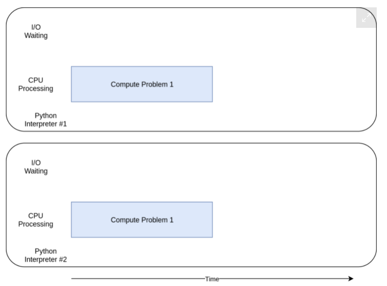 이제 multiprocessing 버전이 빛을 발할 때다. 다른 동시성 라이브러리들과는 다르게 multiprocessing은 무거운 CPU 작업을 여러 CPU에 나눠서 처리하기 위해 고안되었다. 실행 시간 다이어그램은 아래와 같다.