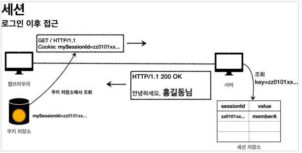 - 서버는 클라이언트에게 쿠키 값을 매번 받아서 내부의 세션 저장소에서 세션 ID 조회하여 사용자를 식별한다.