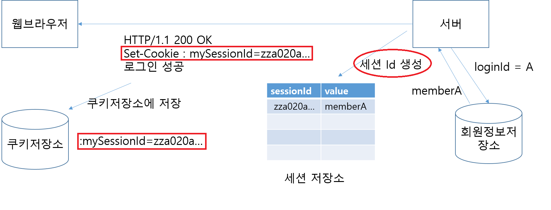 - 서버에서는 해당 사용자의 세션 ID값이 없는 것을 확인하고 새로 세션 ID 생성하여 세션 저장소에 보관한다.