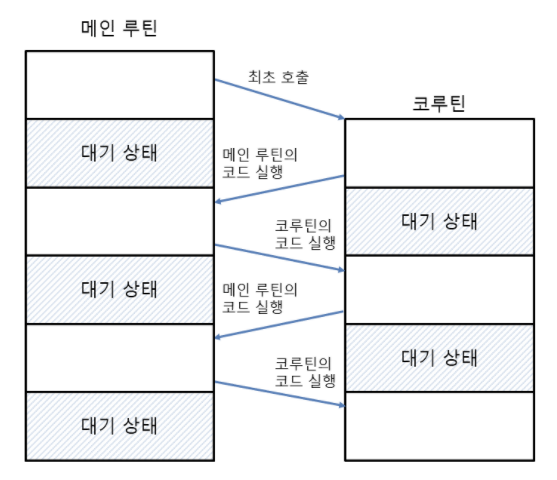 코루틴에서 'Co'는 with 또는 together를 뜻한다. 즉, 메인 루틴과 서브 루틴이 서로 대등한 관계라는 것이다. 그래서 코루틴은 메인 루틴과 서로를 호출하면서 제어권(실행 권한)을 주고 받는다. 코루틴은 특정 시점에 자신의 실행 작업을 일시적으로 관련된 현재 상태를 어딘가에 저장한 뒤, 나중에 다시 실행을 재개할 수 있는 서브 루틴이다.