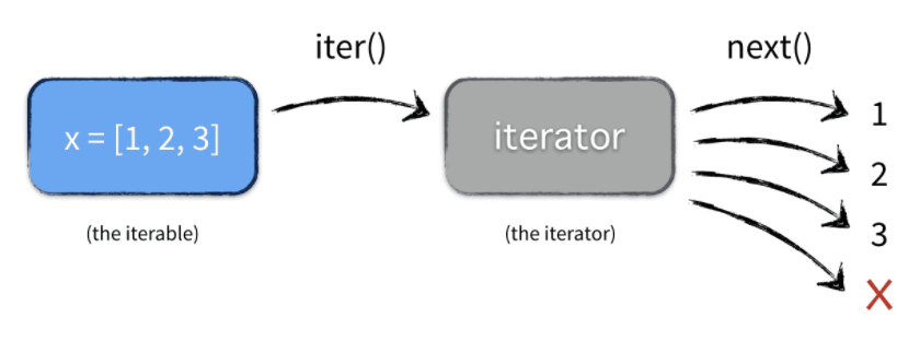 즉, iterable 객체에 __iter__()를 적용해서 iterator 객체를 얻고, __next__() 메소드를 이용해서 차례대로 값을 얻는다. iterator는 값을 반환한 시점의 상태를 기억하고 있기 때문에 next를 호출하면 다음 값을 반환할 수 있다.