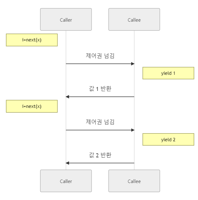 - Caller는 제너레이터 객체를 생성하고, next()를 호출하는 시점에서 제어권을 generator로 넘긴다.