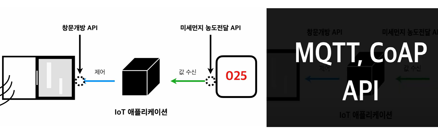 미세먼지 측정기에서 미세먼지 농도 값을 읽어와서 공기가 안 좋으면, 자동으로 창문을 개방하는 IoT어플리케이션을 개발하고 싶다고 하자. 미세먼지 측정기와 스마트 창문이 IoT 애플리케이션과 통신(소통)할 수 있는 API가 있어야 한다.
